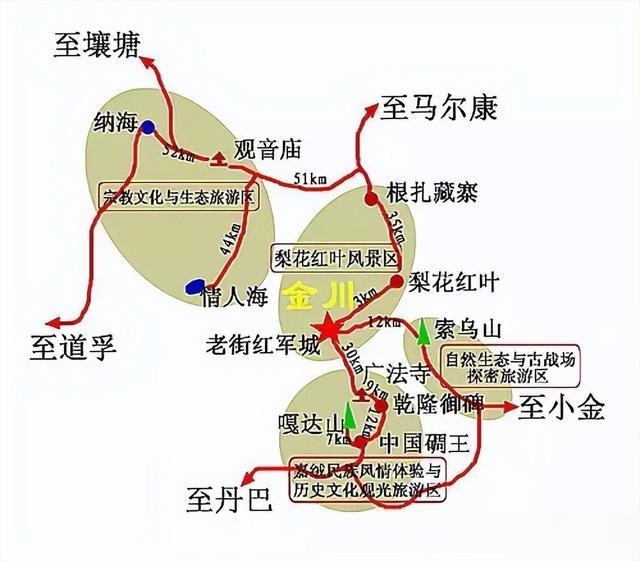除梨花外,金川还有很多值得一去的地方。如,观音庙、情人海、昌都寺、老街红军城、安宁御碑、马尔邦碉王等。