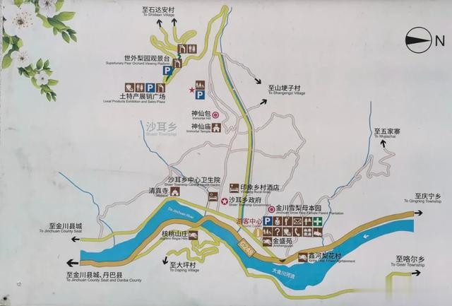 金川梨花主要分布在大金川河谷,集中在沙耳、庆宁、喀尔三个片区。沙耳、庆宁在大金川河的西侧,沙尔在南,庆宁居北;喀尔则在大金川河的东侧。在百度、高德地图中,金川一些村庄、观景台标注不准确,导航时需注意。